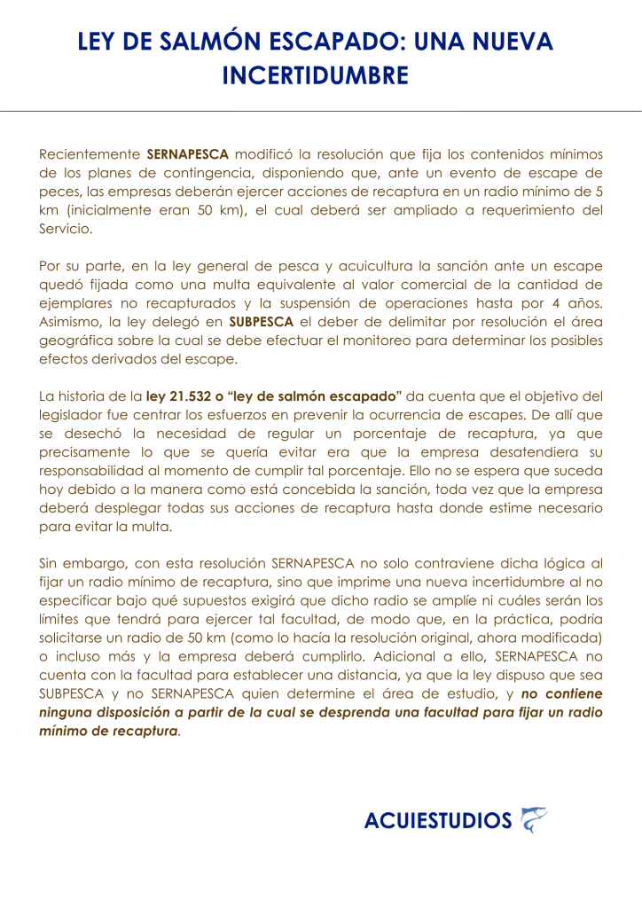 Eugenio Zamorano, integrante del equipo ACUIESTUDIOS, analiza este tema en su columna “Ley de Salmón Escapado: una nueva incertidumbre”, donde plantea que SERNAPESCA no tiene facultad para fijar un radio mínimo de recaptura. Al hacerlo, contraviene la lógica de la ley e imprime incertidumbre al no especificar cuándo ni hasta dónde exigirá extender dicha área de recaptura.